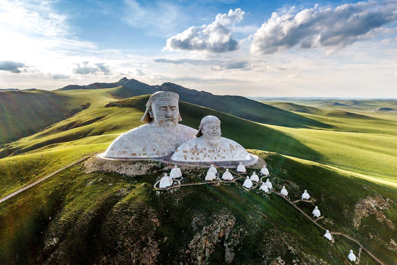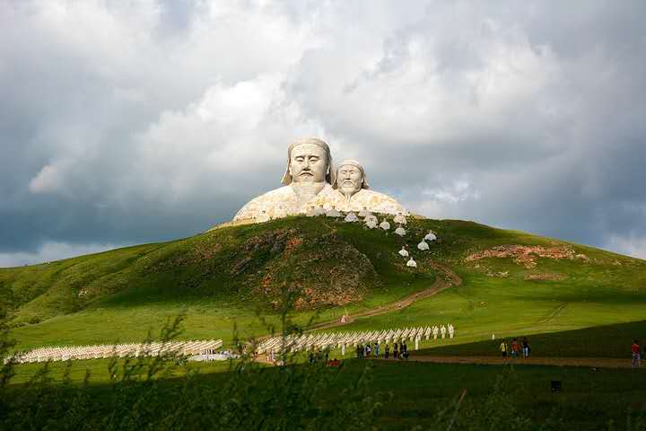 霍林郭勒市可汗山景區(qū)總投資5200萬元,占地面積13000余平方米,景區(qū)由山門、蒼狼之路、蒙元兵陣和蒙古帝王群四部分構(gòu)成,其中成吉思汗頭像雕塑高達50米。