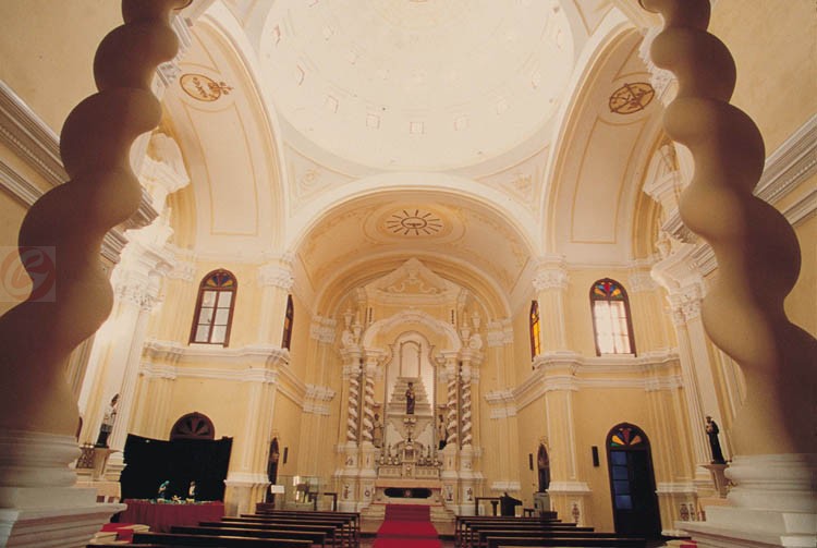 修院圣堂屬巴洛克風(fēng)格。正面有三個入口,主堂平面成拉丁十字型,長軸長27米,短軸長16米,長軸兩端分別為入口前廳及主祭壇。版權(quán)所有山東聊城聊之旅國際旅行社有限公司,轉(zhuǎn)載必究!祭壇供放其主保(圣若瑟)像,裝飾甚多,其中兩組四枝腰纏金葉的旋柱最具特色,柱頭則以破山花形式收結(jié)。而與之呼應(yīng)的是入口前廳中四枝支撐二樓唱詩臺,來自原圣方濟各修道院的木制盤旋柱。四個拱頂形成一四邊內(nèi)彎之正方形空間,其上以一羅馬式穹窿封頂,穹窿直徑為12.5米,頂部高度為19米,開有三環(huán)各16個窗戶,其中最高一環(huán)為假窗,另兩環(huán)才具有透風(fēng)及采光功能,穹頂內(nèi)側(cè)為白色,中間是黃色的耶穌會會的徽。