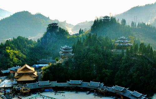 蚩尤九黎城位于重慶市彭水縣紹慶街道與靛水街道結(jié)合部的亭子壩,東經(jīng)摩圍山隧道與彭水老城區(qū)相連,南接彭水新城,北至烏江并與湘渝高速下線(xiàn)互通。總建筑面積11萬(wàn)平方米, 是國(guó)家AAAA級(jí)旅游景區(qū)。景區(qū)以苗族始祖蚩尤文化為主線(xiàn),由40余處單體景觀(guān)建筑構(gòu)成,集苗族文化、旅游景區(qū)、游客接待于一體,繼承和延續(xù)了苗族歷史文化、民俗風(fēng)情,重現(xiàn)“九黎之城”歷史風(fēng)貌,是展示和傳承苗族文化的窗口和基地,彰顯出的是苗族文化的厚重和豐富的內(nèi)涵。已經(jīng)成為彭水最閃亮的城市名片、旅游名片,成為渝東南乃至湘鄂川黔渝邊區(qū)旅游廊道上璀璨的明珠。
