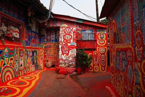 起源于住在臺(tái)中市南屯區(qū)嶺東科技大學(xué)附近有一處舊眷村的八十七歲老榮民黃永阜,因?yàn)椤笩o聊」而拿起畫筆彩將眷村內(nèi)的巷弄街道當(dāng)成了天然的畫布,在上頭彩繪了各式美麗的彩虹線條與可愛動(dòng)物,不僅染亮了小村,在網(wǎng)路上引起熱烈討論,更形成一股參訪風(fēng)潮。黃永阜先生86歲時(shí)開始作畫,他用自己手中的畫筆在眷村老舊的房屋和街道上勾勒出一個(gè)色彩斑斕的童話世界。老人最初只是在自家的屋里屋外用畫筆描繪心事,打發(fā)時(shí)光。后來不少鄰居被他充滿童真的畫所吸引,也邀請(qǐng)他去作畫,就這樣老人在無意中創(chuàng)造了一段色彩繽紛的傳奇。如今,他所居住的位于臺(tái)中市春安里的眷村被人們賦予了一個(gè)好聽的名字:“彩虹眷村”,并成為了當(dāng)?shù)氐臒衢T景點(diǎn),每年吸引約50萬人前來參觀,而香港籍退伍老兵黃永阜則被人們親切地稱為“彩虹爺爺”。走進(jìn)“彩虹眷村”,地面上、墻壁上畫滿了色彩艷麗、造型俏皮的兔子、小雞、猴子、小鳥、卡通人物、花朵、太陽以及彩虹等。紅色、黃色、藍(lán)色、綠色、白色,絢爛的色彩和極富想象力的線條,讓人們馬上置身于童話世界中。村口那條數(shù)十米長的巷道是“彩虹爺爺”作畫最多的地方,也是最熱鬧的地方。這里的畫色調(diào)明艷、熱烈,地上用油漆涂成了紅底,上面用白色和黃色等勾勒出小鳥、小雞和兔子等造型;墻上則分區(qū)塊時(shí)而以藍(lán)色為背景、時(shí)而以白色或黃色為背景,上面畫了數(shù)百卡通造型的猴子、貓和孩童。