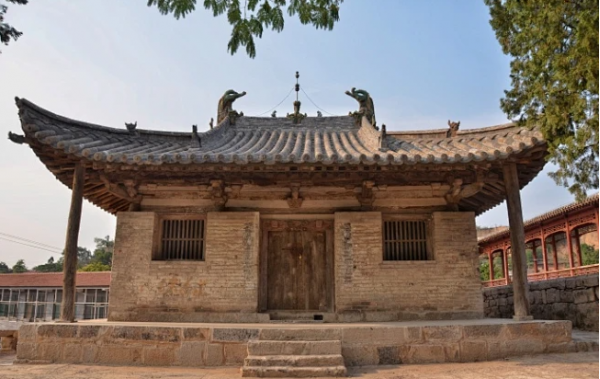 天臺庵,建筑面積90余平方米,現(xiàn)僅存正殿和一通石碑。正殿建于1米高的石臺基上。面闊7.15米,進(jìn)深7.12米。單檐歇山頂,簡板布瓦,琉璃脊獸,屋坡舉折平緩,四翼如飛。檐下四周設(shè)臺明,正面明間臺明下安裝踏跺。殿身四周為圓木柱,柱間施闌額,無普拍枋,柱礎(chǔ)為覆盆式,柱頭卷殺較緩,柱上安有斗拱承托屋檐。殿內(nèi)無柱,四椽栿通達(dá)前后檐柱,結(jié)構(gòu)簡練,相交嚴(yán)實,無繁雜裝飾之感,使殿內(nèi)空間顯得更大,與五臺山南禪寺大殿的建筑結(jié)構(gòu)相近,體現(xiàn)唐代建筑的特點。