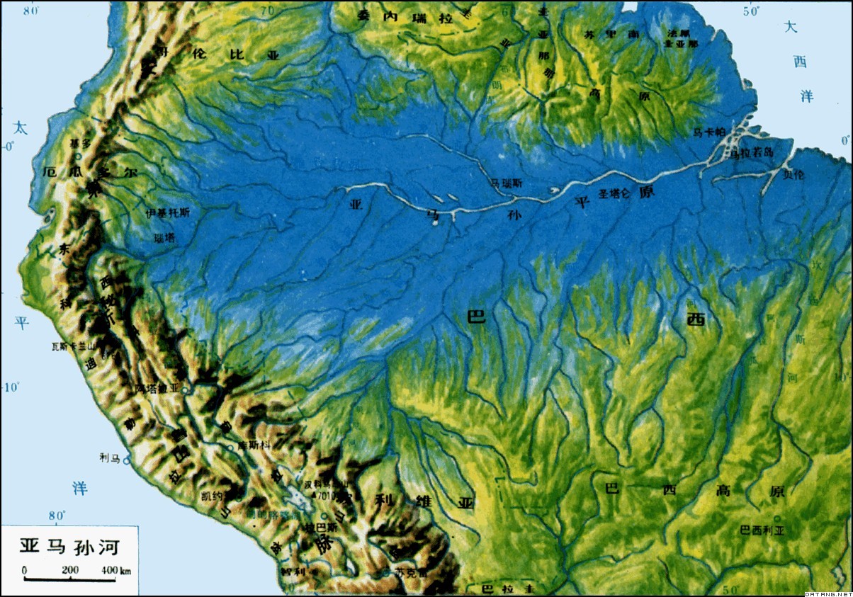 亞馬遜河流域西高東低,南高北低。上游源頭為安第斯山脈及太平洋沿海沖積系統(tǒng),海 拔在3000m以上;干流兩岸多為200m以下的安第斯山沖積層和內陸沖積層。往北為圭亞那高原(海拔300~400m),往南則為巴西高原(海拔300~1500m)。