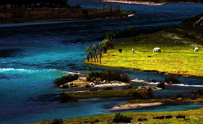 尼洋河在源頭是一條細流,它奔流向前,越流越急。它要沖破各種阻力和障礙,不急不行。到了中游以下,河面已越流越寬,水流也漸漸平緩了下來。這時的尼洋河已漸入佳境,河水中,可以看到對岸青山綠樹的清晰倒影了。天上的白云也到尼洋河里來游蕩,它們在河里弄濕了衣衫,一件一件都掛到天上去晾曬。這時想到一個詞:行云流水。這是一種難以言語的美妙境界,創(chuàng)造這個美妙詞匯的人,當他獲得靈感的那一刻,我想他的心靈肯定已和大自然的美景融為一體了。