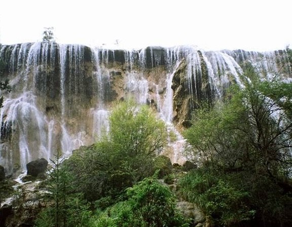 凌空而瀉的瀑布,象銀河倒懸,墜至半空,忽被峭石攔腰斬?cái)啵瑒x時(shí)雪浪飛濺,宛如千萬(wàn)串?dāng)嗑€(xiàn)的珍珠,紛紛揚(yáng)揚(yáng),沿懸立千紉的絕壁陡然下墜,落進(jìn)不見(jiàn)底的深淵,發(fā)出驚天動(dòng)地的狂嘯。而河水卻象兇猛的野獸在咆哮,發(fā)出震耳欲聾的吼聲,仿佛整個(gè)峽谷在顫動(dòng)。每到日落西山,“老虎嘴”彩虹繚繞,雪峰頂上緋紅一片,迷離變幻,奇勝不可名狀。