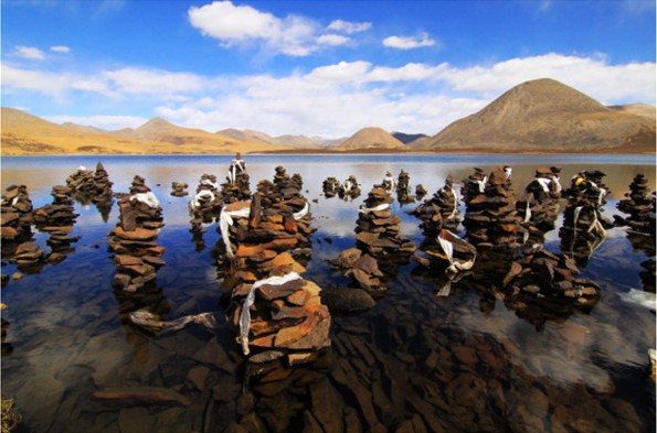 神湖往東望去的山脈上駐有十六尊羅漢,東南邊還可看見雪域著名的摸頂山,供世人膜拜。傳說祭拜此神山不僅能積累福運(yùn)。思金拉措神湖的南邊山脈供奉的曼陀羅,西邊山脈大象背上的寶座。山的左邊可供祭拜黑湖及山的右邊是前往神湖參觀旅游的路口。在它的四周小湖泊星羅棋布,每個(gè)湖泊都有不同的象征意義和歷史淵源,還有顯靈的傳說。在東面有象征五飛天的五個(gè)小湖,南面有象征六趣的六個(gè)湖,西面有象征八尊古如(蓮花生大師八大變化身)的八個(gè)小湖,北面有象征“三怙主”的三個(gè)小湖。
