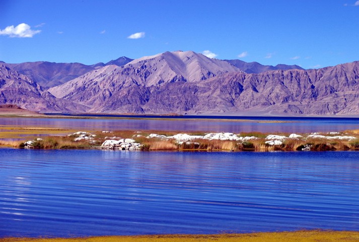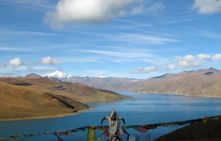 拉軌崗日山的東面是海拔4200米,面積6400平方公里的高原湖泊---羊卓雍錯,藏語意為“天鵝池”。湖槽狹長曲折,形似一只展翅欲飛的天鵝,藏族人民尊之為“圣湖”。相傳,有位仙女因思凡下界而犯天規(guī),上天把她變成天鵝貶在這里,諸峰的神女們都與她戀戀不舍,常來此洗澡與她相伴。而今,洗澡的神女們沒有了,只留下了這個美好的傳說,以及湖中豐富的裸鯉魚和夏季成群的水鴨。“圣湖”南面有座千年古剎桑丁寺,屬喇嘛噶舉派(自教),是西藏唯一女活佛多吉帕姆的主持院。
