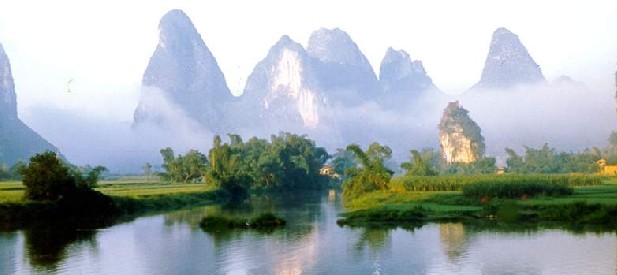 巖溶槽谷平原中,秀山麗水相輝,景色清幽。桂林至陽朔之間,是巖溶峰林峰叢地貌,河流依山而轉(zhuǎn),形成峽谷,景致也最迷人,尤以草坪、楊堤、興坪為勝,有浪石起奇景、九馬畫山、黃布倒影、半邊渡等美景。倒影是漓江一大奇觀。江水賦予凝重的山以動態(tài)、靈性、生命,同時把人帶進神話的世界。漓江兼有“山青、水秀、洞奇、石美”四絕,還有“洲綠、灘險、潭深、瀑飛”之勝。江中多洲,岸邊多灘,亂石遏流,浪回波伏,茂樹環(huán)合,翠竹競秀。漓江景觀并因時、因地(角度)、因氣候不同而變化。晴朗天候,上下天光,一碧萬頃,千巒百嶂,盡人眼簾。煙雨之日,嵐霧繚繞,若隱若現(xiàn),若斷若續(xù),一派空漾。明月之夜,群峰如洗,江波如練,若置身空靈境界,清遠無限。雄奇瑰麗的百里江日長卷,使人賞心悅目,冶性陶情,凈化心靈,棄俗絕塵??梢哉f:“漓江神秀天下無”。古今中外,不知多少騷人墨客為漓江的綺麗風 光寫下了膾炙人口的優(yōu)美詩文。唐代大詩人韓愈曾以“江作青羅帶,山如碧玉簪”的詩句來贊美這條如詩似畫的漓江。