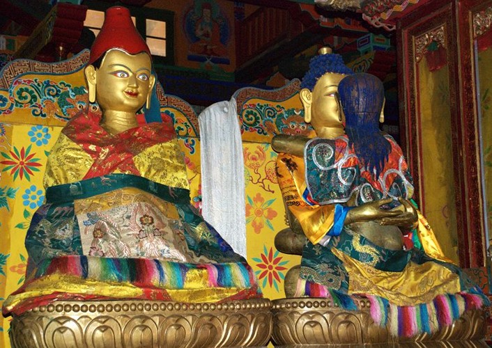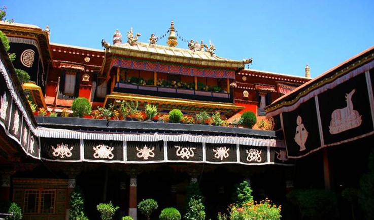 雍布拉康坐落在澤當(dāng)鎮(zhèn)東南約5公里的扎西次日山上,是西藏最早的宮殿。雍布拉康已有2100多年的歷史,3曾建筑。一層的前半部為門廳,面積33平方米,門廳處是一個(gè)帶檐的小平臺。后半部是佛殿,供奉松贊干布、文成公主等塑像。第二層亦分前后兩部分,前半部分為三面環(huán)繞矮墻的平臺,后半部是帶天井的回廊。五世達(dá)賴?yán)飼r(shí)在碉樓的頂部加蓋了四角攢尖式金頂。雍布拉康除部分僧房外,還有一間曾供歷代達(dá)賴?yán)飦泶硕Y佛時(shí)居住的臥室。