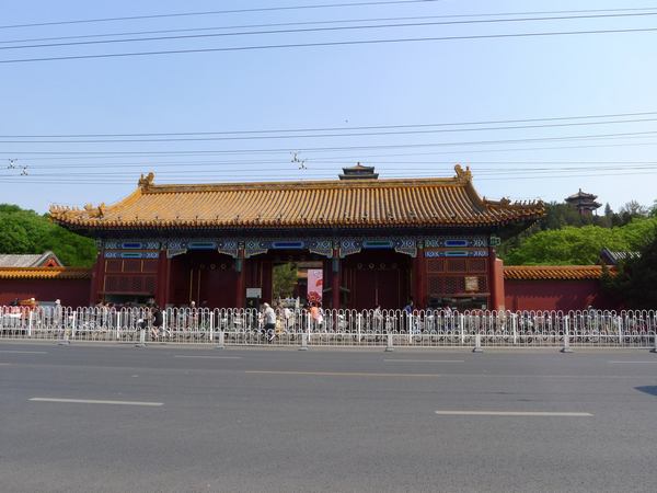 宮門:為外院正門。牌樓式拱券門三座。黃琉璃瓦廡殿頂,琉璃重昂五踩斗栱。門口為清乾隆時(shí)期雕鑿的石獅一對(duì)。然根據(jù)園方說(shuō)明牌顯示,現(xiàn)置一對(duì)石獅為元朝遺物。