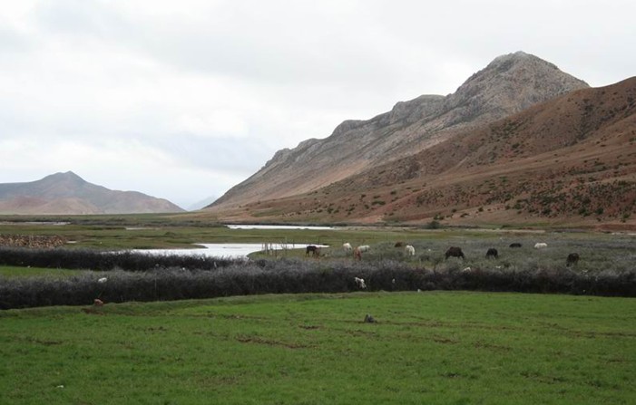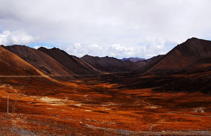 位處昌都地區(qū)三江流域之高山深谷中的邦達草原是一塊地勢寬緩、水草豐美的高寒草原。怒江支流玉曲上游蜿蜒流淌其中,兩岸廣闊的低濕灘地上生長著茂密低矮的大蒿草、苔草之類的草甸植物,綠茵如氈,除成群牛羊在那里游蕩覓食外,偶爾也會有一些藏原羚出沒于其間。圖上所示為冬季時節(jié)的邦達草原,牧草已趨枯黃,顯得有點蕭索荒涼,缺少些許生機。然而因位處西藏東部,降水稍多于西藏中西部地區(qū),牧草生長狀況較好,這里是西藏境內(nèi)較為優(yōu)良的天然草場,畜牧業(yè)比較發(fā)達。