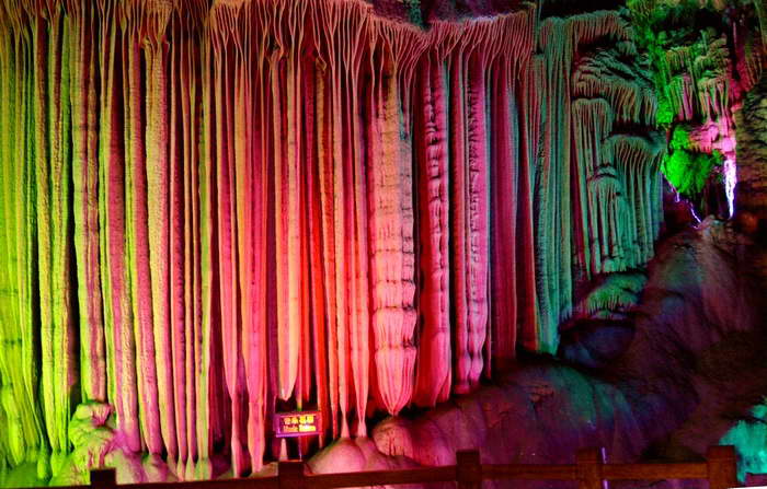 進(jìn)入景區(qū),似步入世外桃源,群山環(huán)抱,碧水潺潺,楊柳婀娜,桃花滿園。古寨依山而座,炊煙裊裊,雞犬相聞,淳樸的鄉(xiāng)風(fēng)讓人迷醉,飲一碗地道的油茶,品一杯香醇的水酒,傾聽關(guān)于銀子巖的神秘傳說,讓人忘卻紅塵,不忍歸去。走進(jìn)銀子巖,如水般的清涼和平靜撲面而來;明白了栩栩如生、惟妙惟肖、巧奪天工。贊嘆、驚訝、緊張,銀子巖的鐘乳石奇形怪狀,在各色燈光的照射下,一條條石筍上就像綴滿了銀粉,白的像一塊塊玉石,紅的似一簇簇珊瑚,綠的若一片片翡翠,黃的如一顆顆琥珀。燈光與天然的石筍融為一體,好一個(gè)人間仙境。穿行在銀光四射、熠熠生輝的石府中,游客會(huì)深刻地領(lǐng)悟到銀子巖三個(gè)字的由來。巖洞有老中青幼四種不同年紀(jì)的石鐘乳,老的色澤蒼黃,中青年的則白里透黃,色澤明艷,幼年則銀白如玉。銀子巖地貌奇特,有偉岸的音樂石屏,彈指有聲,聲如天籟;有繽紛的林海雪原,寬闊遼遠(yuǎn),不知其源頭;地面的沖積巖酷似萬里長(zhǎng)城,蜿蜒起伏在洞穴之中;巖頂?shù)墓质跓艄獾妮x映下,有的巨大的豎琴排列齊整,有的像南天一柱的定海神針,有的如獅虎猛獸,有的像入定高僧,有的似域外仙人,奇美景象應(yīng)接不暇。宛如漫步在廣寒宮,幻象不斷。