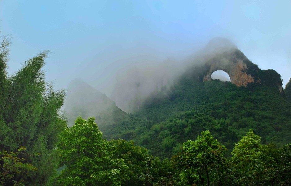 月亮山是陽朔境內(nèi)的奇景,它位于高田鄉(xiāng)鳳樓村邊,高達380多米。因為山頂是有一個貫穿的大洞,好像一輪皓月,高而明亮,所以人們叫它明月峰,俗稱月亮山。游人可順著一條800多級的登山道直達月洞。這個月洞大得離奇,高寬各有50米,而山壁卻只有幾米厚。洞的兩壁平整似墻,洞的頂部卻掛滿了鐘乳石,形狀各異。其中兩塊很像月宮里的吳剛和玉兔。在晴天的時候,游人可以透過月洞看到藍天白云,好比一面掛在山顛上的圓鏡。由于月洞的北側有一座圓形的小山,所以游人走山南的賞月路,從不同的角度觀賞月洞,可以看到圓月、半月和眉月的不同景象。清代徐廷諍稱此景是月掛高峰,他作詩道:“峰巒頂上鏡光浮,旦夕空明未見收。自昔懸崖崩一角,至今遺魄照千秋。山穿月曜無圓缺。月出山輝任去留。萬古不磨惟此鏡,與君長作廣寒游。