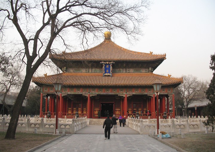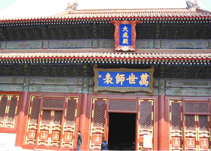 全國(guó)重點(diǎn)文物保護(hù)單位。位于北京城內(nèi)東城區(qū)國(guó)子監(jiān)街。占地2.2萬平方米。歷代多次重修,為元、明、清三代祭孔建筑,又名"先師廟"。廟坐北朝南,大門稱先師門,仍保持元代風(fēng)格。前有琉璃壁及下馬碑,進(jìn)門東西有碑亭、神廚、神庫(kù)等,并立有元、明、清三代進(jìn)士題名碑118 方,題刻歷代進(jìn)士5萬多名。進(jìn)大成門至第二進(jìn)院,正殿名大成殿,為孔廟主體建筑,面闊9間,進(jìn)深5間,黃琉璃筒瓦重檐廡殿頂,殿前月臺(tái)三出陛,殿內(nèi)供奉孔子及"四配"、"十二哲"。殿前有600余年樹齡的古柏一株,名"除奸柏",亦名"觸奸柏"。有古井一口,清高宗賜名"硯水湖"。大成殿后有崇圣祠,自成院落,為祭祀孔子先祖之地。今辟為首都博物館,展出北京地區(qū)出土的歷代珍貴文物。