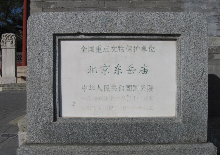 全國重點文物保護單位。位于北京市區(qū)東部朝陽區(qū)朝陽門外神路街。占地約6萬平方米,是道教正一派在華北地區(qū)最大的廟宇。始建于元延?六年 (1319),由玄教大宗師張留孫和其弟子吳全節(jié)募資興建。至治三年(1323)完工,賜名東岳仁圣宮,主祀泰山神東岳大帝。清道光年間擴建。