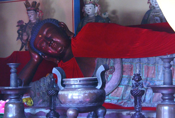 北京西山臥佛寺(Wofo Temple) 由于寺內(nèi)有一尊巨大的釋迦牟尼銅像、臥佛寺由此而得名。臥佛身長(zhǎng)5.2米,用銅25000公斤 、鑄佛用工7000人。銅佛作睡臥式,頭西面南側(cè)身躺在一座榻上,左手平放在腿上,右手彎曲托首頭部。據(jù)說這是釋迦牟尼的紀(jì)念像。旁邊站著12尊小佛像,是他的12個(gè)弟子。他們的面部表情沉重悲哀,構(gòu)成一幅釋迦牟尼向12弟子囑咐后事的景像。殿的正面墻上掛一塊"得大自在”的橫匾,意思是得到人生真義也就得到最大自由。殿門上方亦有橫匾,書有"性月恒明”,意為佛性如月亮,明亮興輝永照。