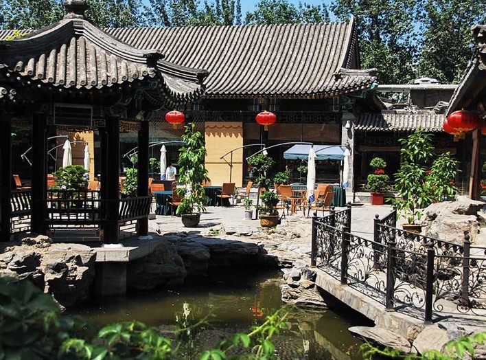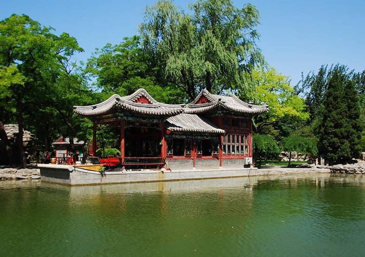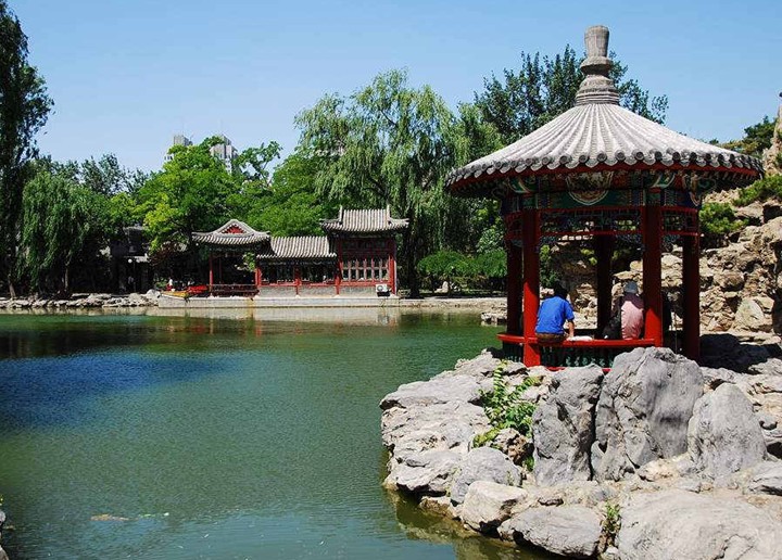 融合了江南庭院的湖光山色和古樸典雅的北方園林風光。景區(qū)有近4700平方米的湖面。湖畔倚建古色古香的水榭、畫舫、小園亭,湖南北架以曲橋、拱橋。