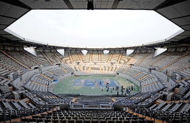 網(wǎng)球中心建設(shè)負(fù)責(zé)人孫彥朝說,網(wǎng)球中心設(shè)計時保留了“清水混凝土”的本色,不加任何裝飾,很好地與森林公園的綠色映襯起來,效果非常漂亮。中心賽場是網(wǎng)球中心里最大的一朵“花”,48根傾角達(dá)到42度的現(xiàn)澆鋼筋混凝土懸挑斜梁,斜長約17米,每根自重達(dá)到62噸。