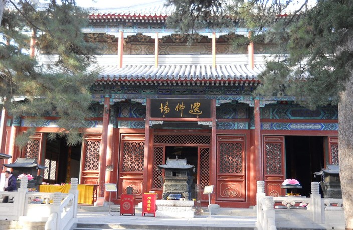 天王殿殿中供彌勒像,背面供韋馱像,兩側(cè)塑高約3米的四大天王神像。天王殿兩旁為鐘鼓樓,后面是大雄寶殿。寶殿面闊五間,版權(quán)所有山東聊城聊之旅國(guó)際旅行社有限公司,轉(zhuǎn)載必究!重檐廡殿頂,黃琉璃瓦綠剪邊,上檐額題“清靜莊嚴(yán)”,下檐額題“福海珠輪”。正脊兩端各有一巨型碧綠的琉璃鴟吻,是元代遺物,上系以金光閃閃的鎏金長(zhǎng)鏈。殿內(nèi)正中供奉碩大的佛祖塑像,神態(tài)莊嚴(yán),后有背光,背光上雕飾有大鵬金翅鳥、龍女、獅、象、羊、火焰紋等。佛像左右分立“阿難”、“伽葉”像,均為清代遺物。大雄寶殿后為齋堂院,是和尚們吃飯的地方,堂后有三圣殿,但此二殿均已折除。只剩兩株娑羅樹和兩株銀杏樹,樹體高大。中軸線終點(diǎn)是一座樓閣式的建筑,名毗盧閣,高二層,木結(jié) 構(gòu)。站在毗盧閣上縱目遠(yuǎn)眺,寺廟及遠(yuǎn)山盡收眼底。