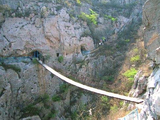 佛爺洞與七星洞有一峽谷相隔,景區(qū)開發(fā)者便凌空架起一道35米開的鐵索橋,把天塹變?yōu)橥ㄍ臼箖啥聪噙B,人踏鐵索橋一步九顫蕩悠悠,頓生“大渡橋橫鐵索寒”之感。不過,這里的鐵索橋絕對安全,被人譽(yù)為“冀南一絕有驚無險(xiǎn)”是游人獵奇探險(xiǎn)鍛煉意志和膽量的絕佳場所。