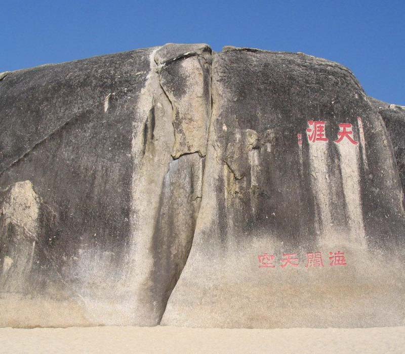 “天涯海角”并非地理位置上的盡頭,而是意境意義上的天涯海角。史載,“天涯”兩字為清雍正年間崖州知州程哲所題,銘刻在一塊高約10米的巨石上。(巖石下方有郭沫若詠“天涯海角”的三首詩題刻)“海角”兩字刻在“天涯”右側(cè)一塊尖石的頂中端,據(jù)說是清末文人題寫。