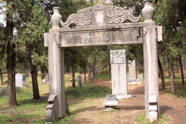 孔子墓前東側(cè)有三亭,是宋真宗、清圣祖和清高宗來(lái)此祭孔時(shí)停留之處,叫作“駐蹕亭”。 墓南二百米處的亭殿后,有子貢親手栽植的楷樹(shù)遺跡和“子貢廬墓處”。 孔林中除孔子墓外,氣派較大、墓飾規(guī)格也高的,要數(shù)第七十二代孫孔憲培妻子的墓——于氏坊。這位于氏夫人原來(lái)是乾隆皇帝的女兒,因當(dāng)時(shí)滿(mǎn)漢不通婚,皇帝便將女兒過(guò)繼給一品大臣于敏中,又以子女名義下嫁給衍圣公,故稱(chēng)于氏坊。