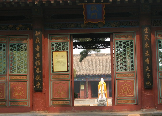 據(jù)《孟子》記載:“孟子曰:‘伯夷,圣之清者也;伊尹,圣之任者也;柳下惠,圣之和者也;孔子,圣之時(shí)者也。’”意思是說,在圣人之中孔子是最適合時(shí)代的。據(jù)此,清世宗于雍正八年(1730年)欽定孔廟正門名“圣時(shí)門”。圣時(shí)門始建于明永樂十三年(1415年),3間,弘治年間擴(kuò)為5間中設(shè)拱門3券,碧瓦歇山頂,四周是深紅的墻皮,券內(nèi)是杏黃的墻里,前后石階上各有石刻龍陛。由拱門內(nèi)望,令人有深邃莫測之感。