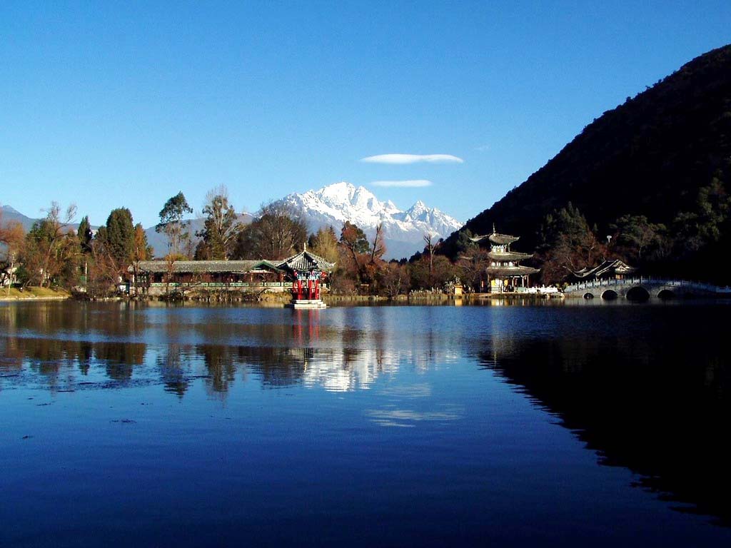 黑龍?zhí)豆珗@位于昆明北郊的龍泉山五老峰下,(亦稱龍泉山麓,太極山、五老山), 昆明黑龍?zhí)墩嫉孛娣e91.4公頃,距離市區(qū)約17公里。這里古木參天,泉壑幽邃,修竹茂林,潭深水碧,景色幽深。民間傳說有黑龍王潛藏于此,故稱黑龍?zhí)兑喾Q龍泉山麓,距離市區(qū)約17公里。黑龍?zhí)秲?nèi)有罕見的大型梅園,是昆明的賞梅勝地,稱為“龍泉探梅”。園內(nèi)的“唐梅”相傳由南詔移植過來,同安寧漕溪寺的“元梅”被認為是云南最珍貴的古梅。在黑龍?zhí)秲?nèi)還有這樣的奇怪現(xiàn)象,潭以中間的石橋為界一分為二,一清一濁,清濁之水互不相融,據(jù)說連魚兒都互不過界,頗為神奇。黑龍?zhí)妒怯忻牡澜虅俚兀譃樯舷聝捎^,從漢代的黑水祠演變而來。上觀始建于唐宋時期,始稱龍泉觀,下觀始建于明代,俗稱黑水宮。1997年,黑龍?zhí)队斡[區(qū)占地3.6公頃。1999年,黑龍?zhí)队酗L(fēng)景林51.4公頃,植有各種喬灌木12萬多株。梅園28.5公頃,地栽梅5794株,盆栽梅1725盆。庭園占地6.9公頃,有喬木3973株,灌木48660株,修竹306叢。 1978年建苗圃,占地5.6公頃。建有杜鵑谷,植各種杜鵑10萬多株。1998年又新辟一期綠化工程,占地33公頃,游覽區(qū)擴大到45.4公頃。園內(nèi)有昆明市綠化委員會掛牌保護的古樹名木18株,是昆明市存有古樹名木最多的風(fēng)景名勝區(qū)。麗江黑龍?zhí)妒冀ㄓ谇《辏?737),其后乾隆六十年、光緒十八年均有重修記載。舊名玉泉龍王廟,因獲清嘉慶、光緒兩朝皇帝敕封“龍神”而得名,后改稱黑龍?zhí)?。詩云?ldquo;泉渙渙兮漣漪,問何時最是可人?須領(lǐng)略月到天心,風(fēng)來水面;亭標標而矗立,看這般無窮深致,應(yīng)記取云飛畫棟,雨卷珠簾。”黑龍?zhí)兑云涮焐愘|(zhì),名列《中國名泉》、《中國風(fēng)景名勝》等書,誠不虛也。迎面見有一座涂金繪彩的牌樓,門口四尊石獅,肌理秀美,威武雄壯,過去守護木氏土司衙門,1966年遷此守護玉泉。進門往右,但見垂柳飄指,一潭澄碧,樹底天光云影,樹梢樓臺隱現(xiàn)。沿潭右堤至鎖翠橋,橋上古人有聯(lián)云:“驚濤撼樹飛晴雪,未雨垂虹臥曲波。”它生動地描繪了橋邊景致。右邊橋下三孔飛瀑,水花四濺,上觀景區(qū)濤聲如雷,流向古城,玉水河畔,楊柳依依,濃蔭蔽日。往橋的左邊看,一座五孔石拱橋,長虹臥波一般,將潭一分為二,玲瓏俊美的一文亭、得月樓分別屹立內(nèi)外潭心,四面臨水,有橋與岸上相連。此樓始建于清光緒二年(1876年),樓名取自古人對聯(lián)“近水樓臺先得月、向陽花木早逢春”中三字。1963年重建時,郭沫若為該樓題寫了匾額“得月樓”三字及兩[1]副對聯(lián)。一副是集毛澤東詩詞句:春風(fēng)楊柳萬千條,風(fēng)景這邊獨好;飛起玉龍三百萬,江山如此多嬌。另一副是郭老撰書的楹聯(lián):龍?zhí)兜褂呈澹瑵擙堅谔?,飛龍在地;玉水縱橫半里許,墨玉為體,蒼玉為神。全聯(lián)僅三十字,卻寫出了麗江黑龍?zhí)兜纳耥?,書法遒勁而灑脫奔放,為公園增色不少。遠處玉龍雪山倒遇潭中,可見“雪山四萬八千丈,銀屏一角深插底”奇景。象山半壁也映入水中,使黑龍?zhí)渡街杏兴杏猩?,山水相映,景色無比秀麗。
