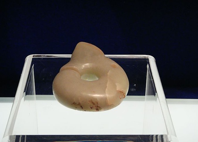 紅山文化后期,約距今6000~5000年。是遼西地區(qū)空前絕后的玉器繁榮時(shí)期,在玉器的器型種類和數(shù)量上都有飛躍性的進(jìn)展。遼寧建平出土的玉豬龍是紅山文化后期玉器制品,豬首龍身,通體呈雞骨白色,局部有黃色的土沁。龍?bào)w蜷曲如玉玦形,首尾相連,器體厚重,造型粗獷。豬首形象刻劃逼真,肥首大耳,大眼闊嘴,吻部前突,口微張,露出獠牙,面部以陰刻線表現(xiàn)眼圈、皺紋。中央的環(huán)孔光滑,背部有一可穿繩系掛的小孔。玉豬龍是身份和地位的象征,也是目前所知時(shí)代最早的龍形器物之一。
