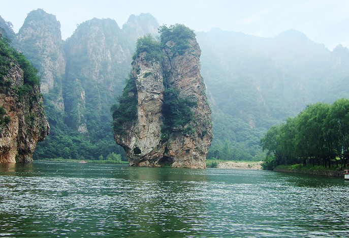 是由英納河緩聚而成的湖,由于冰峪的東南面近海,海水形成的霧氣經(jīng)常大團(tuán)的涌進(jìn)谷口,使這里云霧籠罩,而英納河從西北流來,在這里形成了一個美麗的大湖,云水渡是取云水共渡之意。云水渡是冰峪溝風(fēng)景區(qū)的精華所在,兩岸峭壁秀絕,奇峰怪石林立。其中有一根石柱,高40米,稱之為“中流砥柱”,它周圍的水域叫“龍門潭“,因潭中鯉魚很多,取“鯉魚跳龍門”之意。