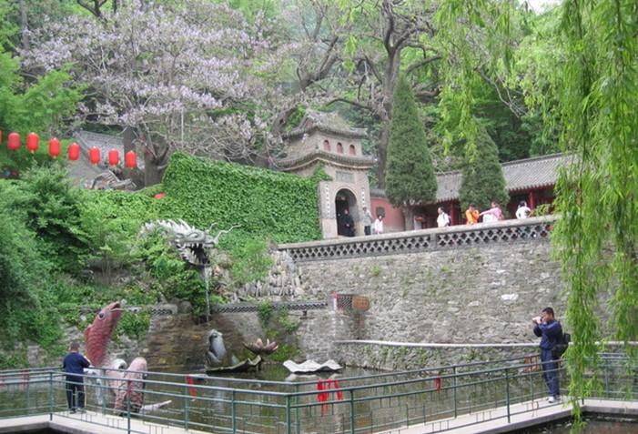 位于大黑山西北麓,是大連地區(qū)著名的道教廟宇,又稱響水寺、韻水寺。相傳建于唐代,后世特別是清代曾多次重修。響水觀依山而建,為歇山或二層磚砌飛檐結構,山門配以赭紅色垣墻,再加上門外一道坡度較大的臺階,使廟宇顯得巍峨莊嚴。 響水觀分南北兩院,進山門即是正殿后土殿。這是一座近十米高的硬山式三楹出廈殿堂,青磚灰瓦,雕梁畫棟,富麗堂皇。殿內供奉著后土、女蝸、觀音等神圣。殿前院內有池塘和五棵合抱粗的大樹,清水綠蔭,滿院生涼。北院有精舍數(shù)椽,紅色木柱木棱花窗,幽靜古樸,是道士們的住處和客舍。 響水觀正殿右側有一個40米深的天然洞穴,叫做瑤琴洞,洞內有清泉一泓流出,潺潺作響。泉水流出后,自南而北從嵌在寺外壁上的龍口中瀉下,版權所有山東聊城聊之旅國際旅行社有限公司,轉載必究!激至蹲伏于水塘中的碧蟾口中,嘩嘩作響,飛傳山谷,故名“響水觀”。