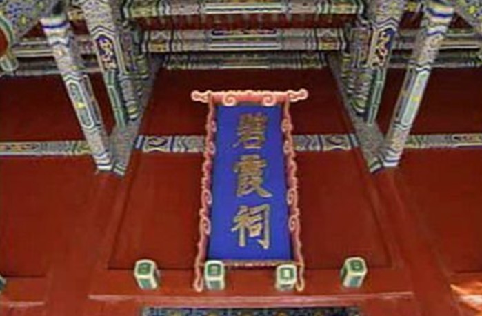 殿內(nèi)槽柱上施四柁隔架斗拱。柱上施井字形天花板,正間內(nèi)斗拱相圍呈八角形藻井,中間高浮雕盤龍戲珠。正間和西次間均設(shè)石雕仰覆蓮紋須彌座神臺:正間神臺裝木構(gòu)雕花神龕,祀元君銅像,兩側(cè)為眼光、送生兩神銅像;東次間神臺供眼光奶奶及二侍女銅像,西次間神臺供送子娘娘和二侍女銅像。正殿內(nèi)懸康熙帝巨匾“福綏海宇”。