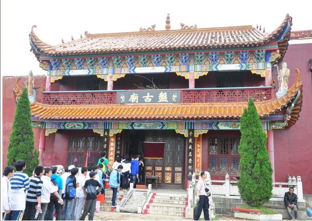 地處河北省滄州市北的青縣城南6公里有村曰“大盤古”,村西有座盤古廟。盤古廟始建于元世祖至元十五年(1278年),明弘治和崇禎年間曾重修,清康熙二十七年(1688年)因河流沖刷,設(shè)于秋祠西南重建,均有碑記。據(jù)文獻記載和民間傳說,當(dāng)年的盤古廟狀似北京的故宮三殿,石、磚、木結(jié)構(gòu),琉璃瓦蓋頂,金碧輝煌,蔚為壯觀。前殿高三丈六尺,象征一年360天;臺階18級,為18層地獄之說;飛檐椽子108根,按36天罡、72地煞而布;每根椽頭系銅鈴一枚,照工、商、角、征、羽五音而置,有所謂“風(fēng)搖鈴響天動樂,光照殿頂?shù)厣x”之說。殿內(nèi)有身披樹葉,手托日月的鐵鑄涂金盤古像,高一丈零八寸。中殿塑有南海觀音像,股坐蓮盆,金童玉女立兩側(cè)。版權(quán)所有山東聊城聊之旅國際旅行社有限公司,轉(zhuǎn)載必究!后殿設(shè)老君、孔子、龍王三塑像,殿前有合抱粗的合歡樹兩株,殿后鐵磬懸于古槐??上ПP古廟在1947年毀于戰(zhàn)火。九十年代,當(dāng)?shù)厝罕娊M織起來修復(fù)盤古勝跡,以滿足來此朝圣拜祖的人流尋訪。