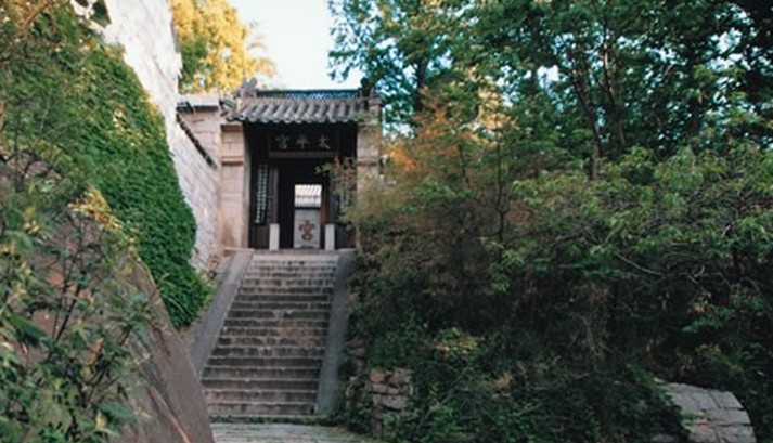 太平宮初名太平興國(guó)院,又稱上苑。系宋太祖為華蓋真人劉若拙敕建道場(chǎng),金明昌年間(公元1190~1195年)重修。正殿名三清殿,配殿為三官殿和真武殿,坐落在嶗山東部上苑山北麓、仰口灣畔。 宮西絕壁矗立,下有天然石洞。洞內(nèi)縱橫各數(shù)丈,高敞如廈;洞頂鐫刻“混元石”三字及星斗圖案;洞旁眠龍石上,鐫“猶龍洞”三字。宮北山坡下有澗水噴涌,相傳曾有農(nóng)人見白龍游泳其中,名白龍澗。澗底巨石累累,橫跨兩岸,水從石隙下瀉,稱仙人橋。過橋山坡有巨石,上刻邱處機(jī)詠嶗山七絕20首及序。 宮東北奇峰突起,形同巨獅,張嘴作怒吼狀,名獅子峰。峰巔崗巒平敞,云氣彌漫,有“獅嶺橫云”勝景。