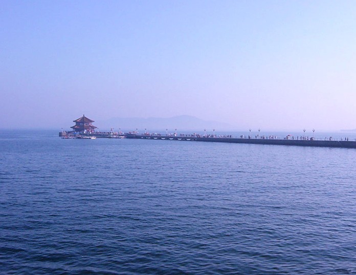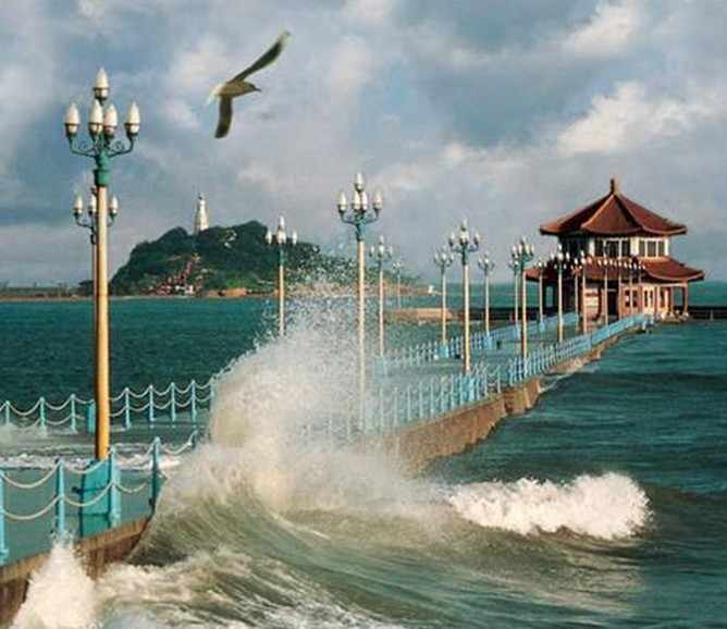 棧橋是青島的象征。位于青島灣中,與市內(nèi)最繁華的中山路成一條直線,由海岸前伸入海,素有“長(zhǎng)虹遠(yuǎn)引”之美譽(yù)。棧橋初建于光緒十八年(公元1892年),是青島最早的碼頭。經(jīng)1931年改建和1985年整修,現(xiàn)寬8米,全長(zhǎng)440米。版權(quán)所有山東聊城聊之旅國(guó)際旅行社有限公司,轉(zhuǎn)載必究!橋南端筑半圓形防波堤,堤內(nèi)是一座具有民族風(fēng)格的兩層八角亭,金瓦朱壁,盔頂飛檐,題名“回瀾閣”。棧橋劃波斬浪,像一條長(zhǎng)龍橫臥于碧海銀波。循橋漸入,仿佛走進(jìn)大海的懷抱;佇立閣旁,層層巨浪澎湃涌來,拍打堤壩,擊起萬千碎玉;入閣內(nèi),沿螺旋樓梯登到樓上,四周盡是寬敞的大窗,放眼望去,又是另一番怡人風(fēng)景,“飛閣回瀾”因此被譽(yù)為“青島十景”之一。