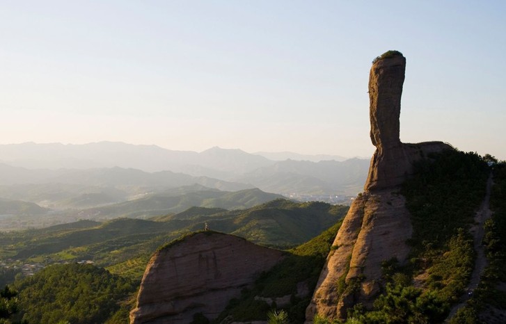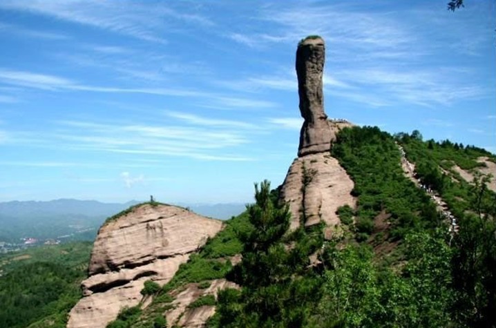 磬錘峰,古稱石挺,俗稱棒槌山。早在1400多年前,北魏著名地理學(xué)家酈道元在《水經(jīng)注》中就有記載,稱其“孤石云舉,臨崖危峻,可高百余仞”。經(jīng)實(shí)際測量,磬錘峰海拔596.29米,槌高38.29米,連同基座高59.42米,上部直徑15.04米,下部直徑10.7米,體積約為6508立方米,重約16205噸,估計(jì)已有300萬年的高齡。峰槌半山腰有一株桑樹,高約3米,大約有300多年的樹齡。