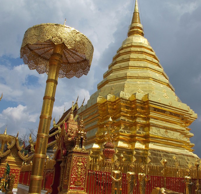 并立而著名的寺廟。據(jù)說,游覽該寺的人,如能數(shù)得出有20座佛塔,必獲吉兆。自南邦府再南走不遠有泰國的棉織中心村。這里盛產(chǎn)泰國棉花,村內(nèi)有約2000架手工紡紗機,是著名的棉織品產(chǎn)地。藏有佛祖舍利子的雙龍寺。雙龍寺位于素貼山山頂,建於1383年,又稱‘舍利子佛寺’。稱為雙龍寺是因為寺門外石階兩側各雕有一條長達500米的巨龍,十分壯觀。稱為舍利于佛寺是因為寺內(nèi)有一座建于16世紀的金塔,據(jù)說塔內(nèi)藏有佛祖釋迦牟尼的舍利子,故被視為圣地。清邁王朝歷代帝王對此寺都十分崇敬,常來此朝拜。而來此朝拜的各地信徒更是絡繹不絕,每年6一7月均在此舉行禮佛盛會。登上素貼山頂可遠眺清邁市全景。