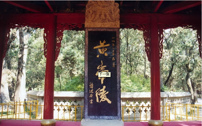 再北為誠(chéng)心亭。面闊五間。進(jìn)深一間。祭祀官員至此須整飾衣冠,靜心凈面,方可進(jìn)入大殿祭祀。再北為碑亭,面闊五間,進(jìn)深一間,卷棚頂。亭內(nèi)立有毛澤東手跡“祭黃帝陵文”和蔣中正手跡“黃帝陵”碑石。