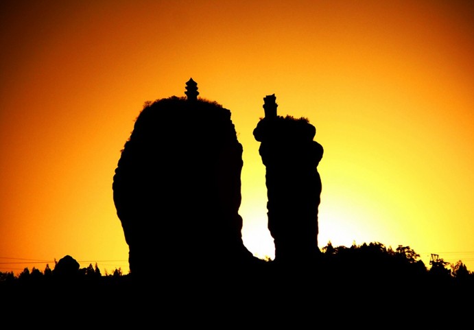 過了許多許多年,地殼變遷,這一帶海水退去,成了陸地,兩個(gè)石礁就是現(xiàn)在的雙塔山。紀(jì)曉嵐在書上說見到的東西,怕就是這對夫婦的遺物。