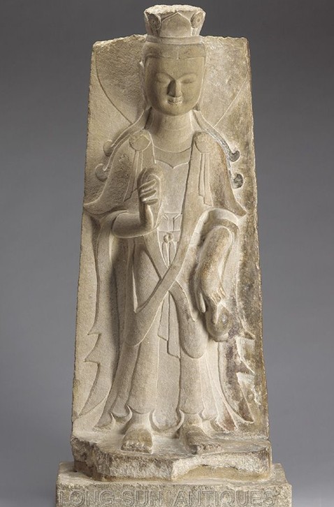 石像高3.9米,腰圍2米,手長40厘米,背北面南,立于50厘米高的石雕蓮花座上。石像刻線明顯,披巾搭胸,細(xì)腰束帶。雕線棱角分明,刀法洗煉,在個體石像中甚為罕見,為我國古代石雕珍品?,F(xiàn)為省級重點文物保護(hù)單位。