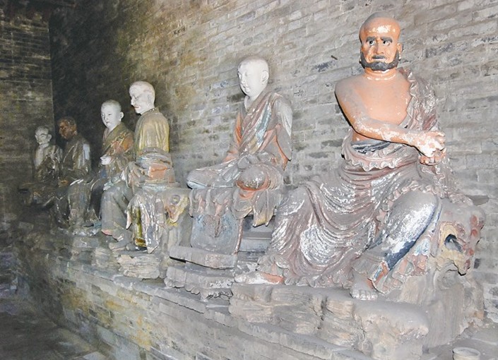 與一般漢地佛寺相同的是,大殿內(nèi)共塑有十八羅漢,其分布是東、西兩側(cè)各九位羅漢。羅漢全稱為阿羅漢,他們是佛的得道弟子,是小乘佛教修行所獲的最高果位(據(jù)說修到了羅漢的境地,就已經(jīng)斷盡三界煩惱,永遠解脫輪回之苦)。