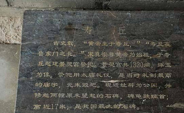 《曲阜縣志•古跡》載:宋大中祥符五年閏十月,宋真宗以始祖黃帝生于壽丘之故,下詔改曲阜縣名為仙源縣,并徙治所于壽丘。詔建景靈宮于壽丘,以奉祀黃帝。根據(jù)《曲阜縣志》引元代至正十年周伯琦《重修景靈宮記》石碑記載:帝建宮祠軒轅曰圣祖,又建太極殿祠其配(應為母)曰圣母。越四年而宮成,總千三百二十楹,其崇宏壯麗無比,……琢玉石為像龕于中殿,以表尊嚴,歲時朝獻如太廟儀,命學老氏者侍祠,而以大臣領之。大碑四通,諺云:‘萬人愁’者是也,其中二碑廣二十三尺,闊半之,厚四尺;赑屃高十有三尺,闊半之,厚四尺,龜趺十有八尺。另二碑廣二十有四尺,闊半之,厚四尺,赑屃高十有八尺,闊十有六尺,厚四尺,龜趺十有九尺,無文字,意者未成而金兵至也。陵曰壽陵(即壽丘)。