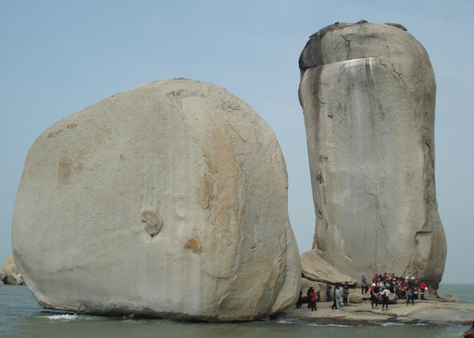 從看澳村岸邊坐渡船,十幾分鐘就到達礁石上,礁石底部是一組平坦完整的巖石。兩個石柱均由粗?;野咨幕◢弾r組成 東側(cè)的一個高達33米,胸寬9米,厚8米,周長57米;西側(cè)的一個高17米,胸寬15米,厚8米周長39.9米。兩個石柱的底部都是近似四方形體,直立在礁石上。據(jù)地質(zhì)學(xué)家考證是世界上最大的花崗巖球狀風(fēng)化海蝕柱。