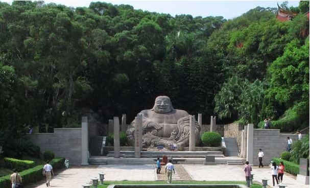 彌勒巖山麓,有一高大石佛盤膝而坐,這就是名聞遐邇的彌勒石雕造像。石佛像始鑿于元至正年(公元1341年),至明洪武年(公元1368年)竣工,高6.8米,寬8.9米,由整塊花崗巖就地琢成,天然妙相,袒胸露腹,兩耳垂肩,笑態(tài)可掬,觀者可以忘憂。經(jīng)國家文物局認定,該石佛為全國最大的立體石刻彌勒佛像,已納入國家級文物保護單位。