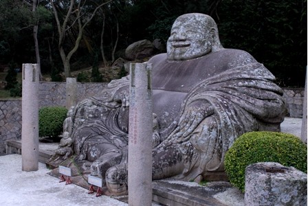 彌勒造像位于瑞巖寺右側(cè),又稱"仁佛".為元至正元年(1341年),本縣人呂伯恭之杰作。及依整塊巖石自然形態(tài),就地鑿成。像高6.4米、寬8.9米、存約8米許,頭部高2.3米、頭頂寬1.8米、耳長1.3米、嘴寬1.1米、肩寬1.6米。石像盤腿趺坐,袒 胸 露臍,左手捻珠,右手撫腹,兩眼平視,雙耳垂肩,笑容可掬,生動逼真,形神兼?zhèn)洌蜩蛉缟?/p>