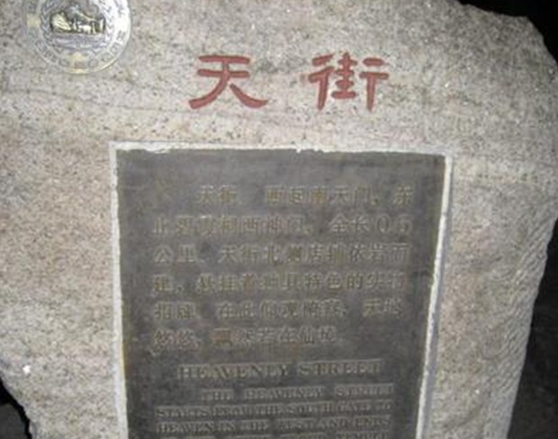 進(jìn)了南天門再上兩層臺階就是天街,天街自古以來就似懸在天上的一條街市。古代的香客,現(xiàn)在的游人都對這條街存有深刻的印象。在長約千米的天街上布滿了賓館、飯店、商鋪。據(jù)記載,天街從清代就開始繁華,當(dāng)時的一些店鋪老板用實物作為招牌,如“棒槌”、“木碗”、“鸚鵡”等。
