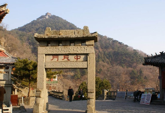 中天門建于清,為兩柱單門式石坊。泰山古時(shí)多虎,古人在坊北建廟祀黑虎神,現(xiàn)廟內(nèi)塑財(cái)神趙公元帥執(zhí)鞭跨虎,東為仿古茶樓,西南為中溪賓館,西北為中天門索道站。中天門峻嶺闊谷,樓閣簇?fù)?。東有中溪山突兀俏麗,可觀日出,望晚霞;西有鳳凰嶺蜿蜓伸展,可遠(yuǎn)眺傲徠雄姿,俯視城廓新貌。佇立坊下,北瞻巍巍岱峰,眾山拱立,林茂泉飛,纜車凌空,天然成畫。