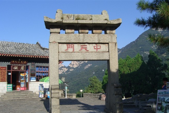 中天門建于清,為兩柱單門式石坊。泰山古時(shí)多虎,古人在坊北建廟祀黑虎神,現(xiàn)廟內(nèi)塑財(cái)神趙公元帥執(zhí)鞭跨虎,東為仿古茶樓,西南為中溪賓館,西北為中天門索道站。