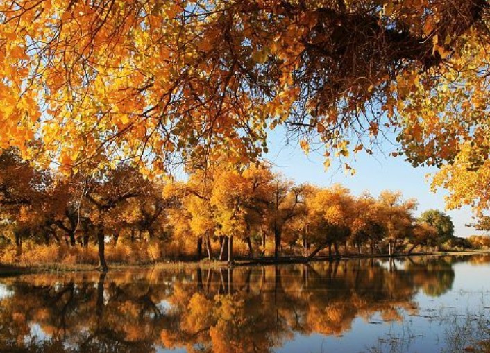 內(nèi)蒙古阿拉善盟的額濟(jì)納旗,現(xiàn)有天然胡楊林45萬(wàn)畝,是世界僅存的三大胡楊林之一,是國(guó)家自然保護(hù)區(qū)和國(guó)家森林公園。胡楊林是一個(gè)古老的樹種,被譽(yù)為“植物活化石”,有“生一千年不死,死一千年不倒,倒一千年不朽”的美譽(yù)。胡楊,又名“梧桐”,為古地中海殘遺物種,屬落葉喬木,蒙古語(yǔ)稱為“陶來(lái)”。胡楊木質(zhì)纖細(xì)柔軟,樹葉闊大清香,耐旱,生命力頑強(qiáng),是自然界稀有的樹種之一。金秋十月,額濟(jì)納是一個(gè)童話般的世界。胡楊金葉掛滿枝頭,細(xì)細(xì)看來(lái),在樹枝間竟尋不到一片異色葉子,密密匝匝,金光燦爛,至純至美;遠(yuǎn)遠(yuǎn)望去,一片片金色的胡楊把大漠裝點(diǎn)得如詩(shī)如畫,匯集成金色的海洋,吸引著大批國(guó)內(nèi)外賓客到此旅游、采風(fēng)、攝影。