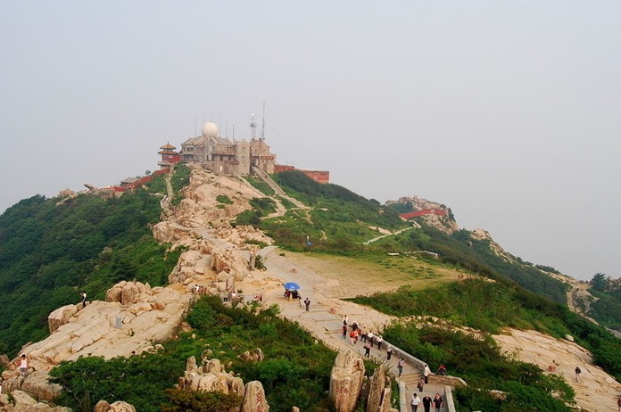 日觀峰,山東游覽名勝。位于玉皇頂東南,古稱介丘巖,因觀日出而聞名。觀日長廊全長30米,亭廊銜接,似仙閣矗立,鮮艷奪目。拱北石又名觀海石。石長 6.5米,北西8度,與地面夾角30度。登臨其上可盡賞旭日東升場面。