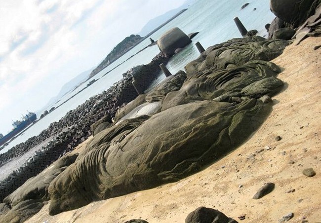 與半洋石帆相對(duì)應(yīng),在看澳村海邊,由于海水侵蝕和自然風(fēng)化,巖壁花崗巖風(fēng)化,形成一座光頭凸肚的彌勒佛像。石像曲膝盤(pán)坐,身高12米,肩寬12米,頭、身、手、足畢現(xiàn),形象生動(dòng),狀如半浮雕。版權(quán)所有山東聊城聊之旅國(guó)際旅行社有限公司,轉(zhuǎn)載必究!圍繞佛身有一條棕黃色的火成巖脈,就象獻(xiàn)給佛像的一條金色“哈達(dá)”,也是自然巧合 ,佳趣天成。另外,這里還有許多天然海蝕景觀,例如雙龜接吻,青蛙等,值得一看。